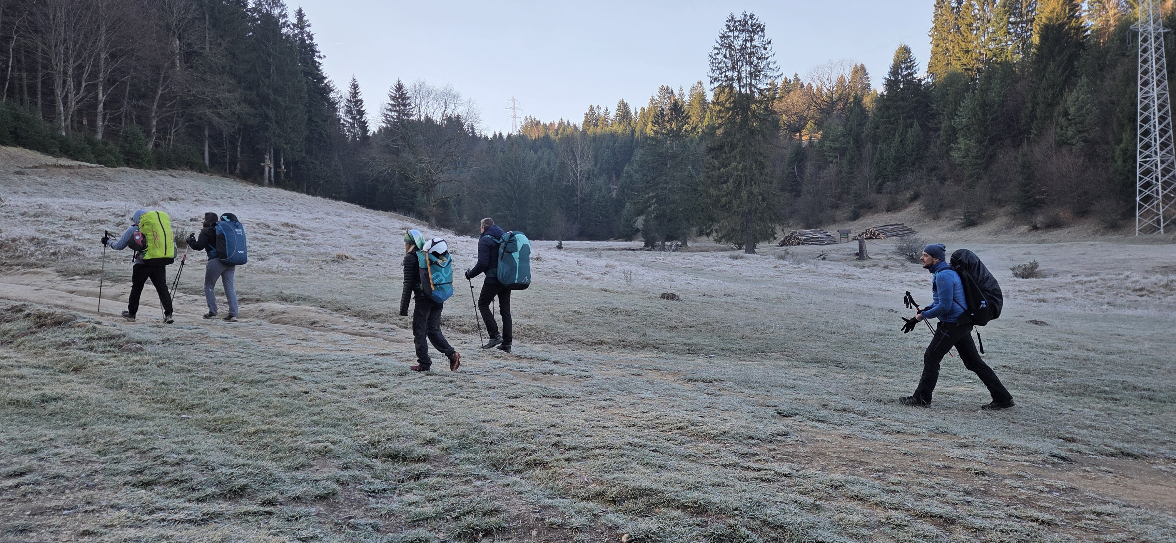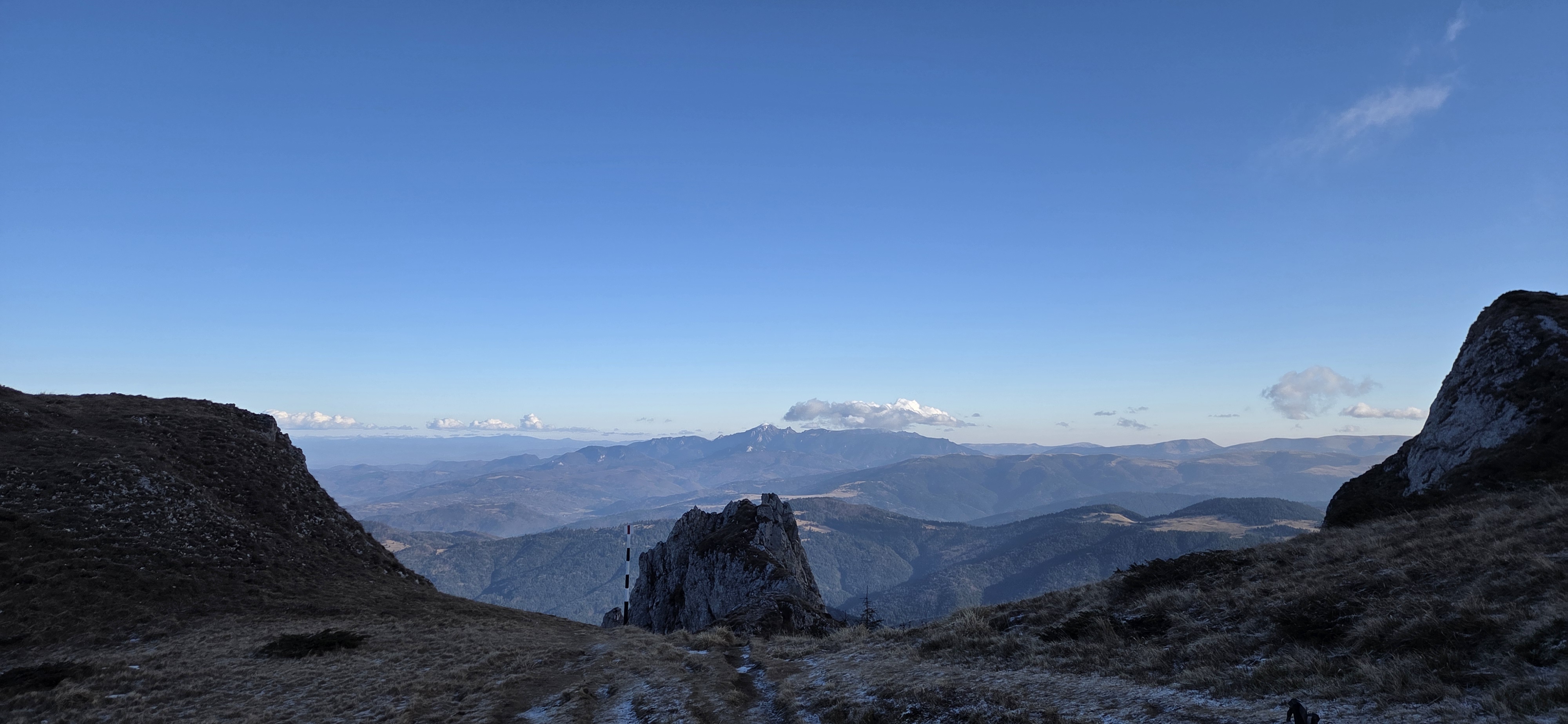 Solul era uscat, fără zăpadă, cu pământ înghețat, perfect pentru mers. Facem câteva opriri scurte – nu din oboseală, ci pentru a respira aerul curat și a savura liniștea muntelui.
